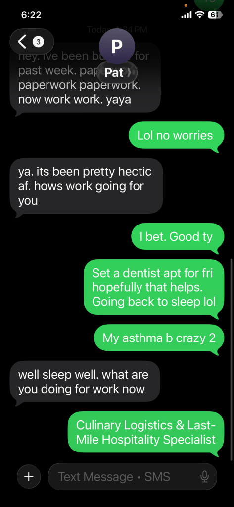 Patrick’s question—“what do you do for a living?”—was like a stale crouton in a gourmet salad. I had options: literal explanation, passive-aggressive fiction, or full Sno’ Witty™️ theatrics. You ghost me and expect me to have gotten a job just so you’d come back? Well Sno’ did do that; but realized it wasn’t for Patrick.